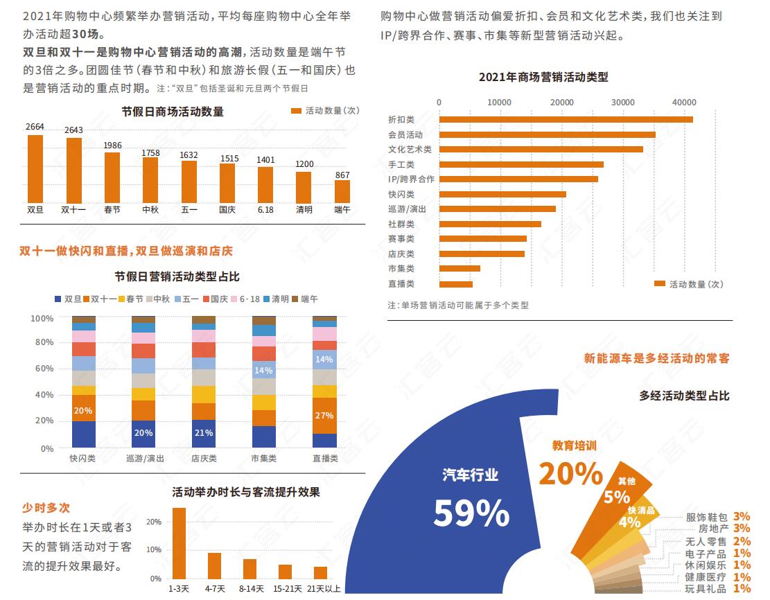 以报告中“营销活动”部分为例,眼下实体商业大大小小的商家都极为注重各个节假日节点的活动,数据显示2021年元旦、春节、清明、五一、端午、中秋、国庆等几个节日的客流量最为可观,其中双旦节日的客流量更是达到高峰。而在众多类型的文艺表演活动中,报告还分析出双十一做快闪和直播、双旦做巡演和店庆的规律。