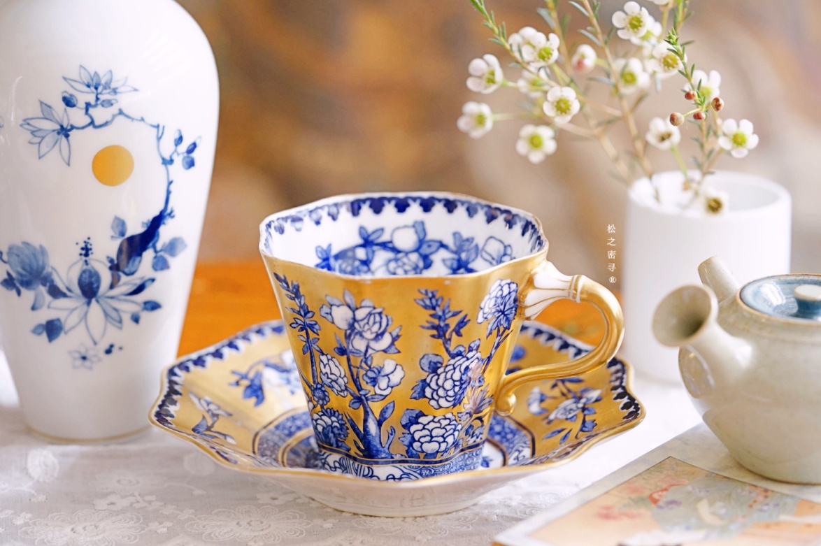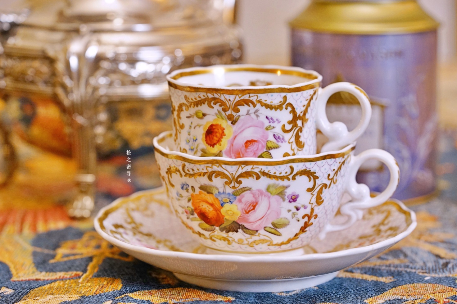 有一日,与一位在英国从事投行工作兼职做瓷器生意的卖家聊天时,她和我分享了她新近的瓷器收藏,那是一套我从来没见过的杯组:钴蓝的釉色为地,上面描绘了丰富花彩,手柄微微上翘,尤其特别的是它是由两个杯子和一个碟子组成的套装,两个杯子的图案花纹和设计虽然一致,但其中一个杯身窄稍高,另一个则身矮且宽,这位朋友竟然将高杯子直接放进矮杯子里叠在一起放置。为什么会使用?这是什么品牌的设计?……我脑海中不断产生这样或那样的疑问,只得去烦扰朋友求得答案。她告诉我,这是1840年代英国明顿(Minton)的瓷器,两个杯子是兼用杯,一个用来喝咖啡,一个用来喝茶,这种设计在英国直到维多利亚晚期都非常流行。在好奇心的驱使下,我当即定下了这套特别之物,拿到实物后才发现,原来照片里看到的完全无法展示出这组瓷器的特别之处:除了第一眼会注意的能叠起来的两个杯子和上翘把手外,杯身上有着多达5次的曲线变化,与中古杯多见的2-3次曲线变化来说,呈现出非常微妙的精致感。此外,尤其打动我的是釉面彩绘的:西洋瓷器主要都是釉上彩工艺,釉上施色对于色彩的表现力更为丰富,这套杯碟的图案以较宽的一圈深钴蓝装饰,其上以描金的葡萄藤蔓点缀在周围,蓝色和金色的搭配显得非常华丽。中间的留白处则是以不同色彩的花束:玫瑰、雏菊、香草等的枝叶、花苞围绕,仔细观察能看到每一笔一画的笔势和色彩的浓淡。文字和图片都难以描述不同时期英国瓷器的特色,只有拿在手中,才会让人对这种差异感到惊叹。也因为如此,我便果断舍弃对中古瓷器的收藏,转向年代更早的英国瓷器收藏,开启了我的收藏新旅程。