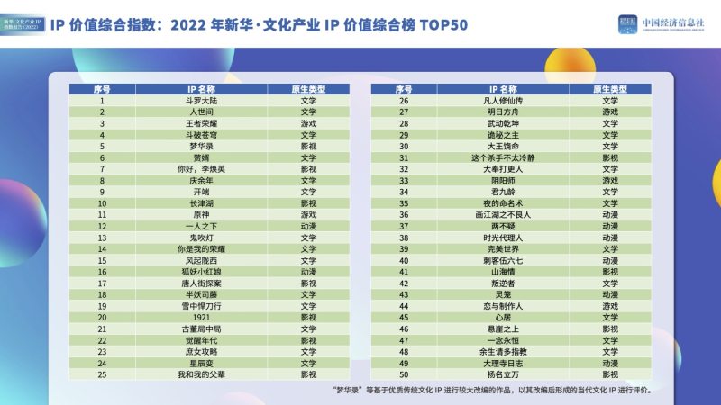 “新华•文化产业IP指数”,选取了2021年1月至2022年6月,有过文学、漫画、动画、影视、游戏、实体衍生等形态改编的作品或该时段的热门新IP共100个,从消费端、传播端、开发端和拓展端四个维度构建综合评价体系,最终公布了表现前50位的IP,《斗罗大陆》、《人世间》、《王者荣耀》、《斗破苍穹》和《梦华录》位列综合价值榜单前五。