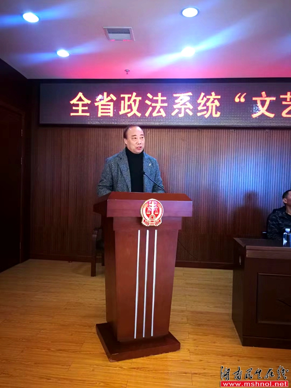 省政法系统书画诗词研究会会长胡红湘作《不断深化争先创优活动,打造湖南政法文艺新高地》的工作报告。