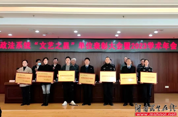 湖南省委原常委、政法委原书记、省政协原副主席李贻衡,省人民检察院原检察长张树海,省文联党组书记、主席夏义生,省高级人民法院党组副书记、常务副院长邬文生,省委政法委副书记王学武,省高级人民法院党组成员、政治部主任李知文,省政法系统书画诗词研究会会长胡红湘等领导出席大会,并为受到表彰的长沙市开福区委政法委、桃江县委政法委,蓝山县委政法委️、衡阳市中级人民法院、长沙县人民法院、邵阳市大祥区人民法院、平江县人民法院、江永县人民法院、会同县人民法院️、娄底市人民检察院、资兴市人民检察院、慈利县人民检察院、邵阳市双清区人民检察院、永州市零陵区人民检察院、岳阳市云溪区人民检察院️、长沙市公安局交警支队、长沙县公安局、安化县公安局、新化县公安局、衡阳市雁峰区公安分局、岳阳市公安局政治部公共关系科️、省怀化监狱共22家“文艺之星”单位颁发奖牌。
