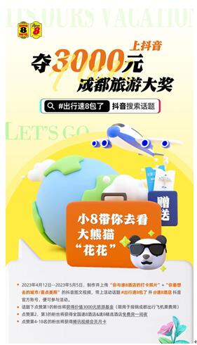 话题下点赞第1名的粉丝将获得价值3000元旅游基金(限用于成都出行飞机票费用),出行速8包了!
