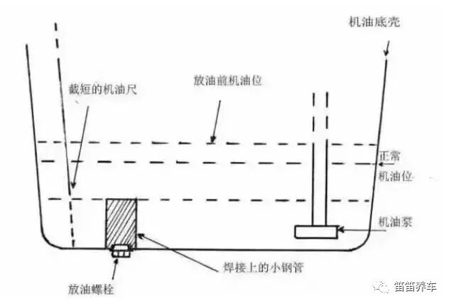 如果奸商用自己准备的车做实验,就在实验前拆下油底壳,在放油螺丝正上部焊接上一根金属管,再将机油尺截短,面对消费者放油。实际油底壳放油螺丝上面焊接到油底壳铁管起到了作用,底部仍然有大量机油,放油后自然机油尺上已经被缩,所以就沾不到机油了,里面机油连续多少公里都没事!