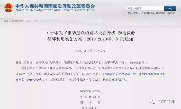 6月6日,发改委、商务部、生态环境三部联合正式发布了《推动重点消费品更新升级 ,畅通资源循环利用实施方案(2019-2020年)》的通知。